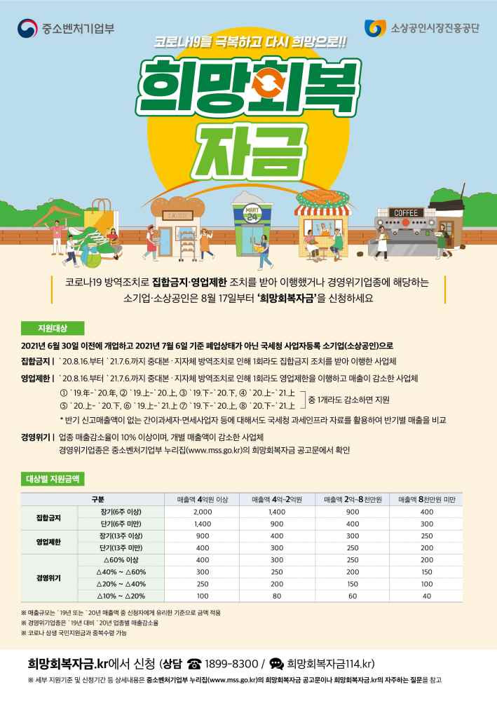 Jul 01, 2021 · 코로나19로 피해를 입은 소상공인에 대한 손실보상과 희망회복자금에는 3조9천억원을 편성했다 희망회복자금. 지원 대상은 지난해 8월 이후 1회라도 집합금지‧제한 조치를 받았거나 매출이 크게 감소한 여행‧문화업계 등 경영위기업종에 해당하는 소상공인과 소기업 113만.